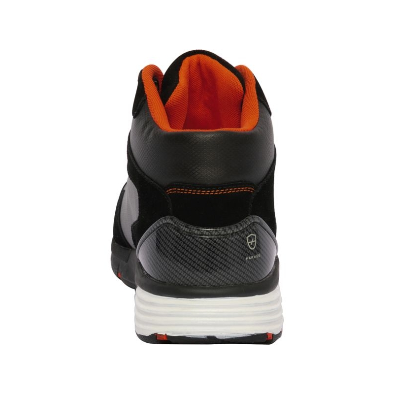 Tige en microfibre et croute de cuir, hydrofuge. Doublure en textile. Première de propreté anatomique et amovible en maille sur mousse PU. Semelle d'usure en caoutchouc / EVA. Semelle antiperforation textile. Embout de sécurité en composite. Poids : 588 g Coloris : noir/orange Pointures : 39 au 48 Norme : CE Cat II - EN ISO 20345 - S3 HRO SRC
