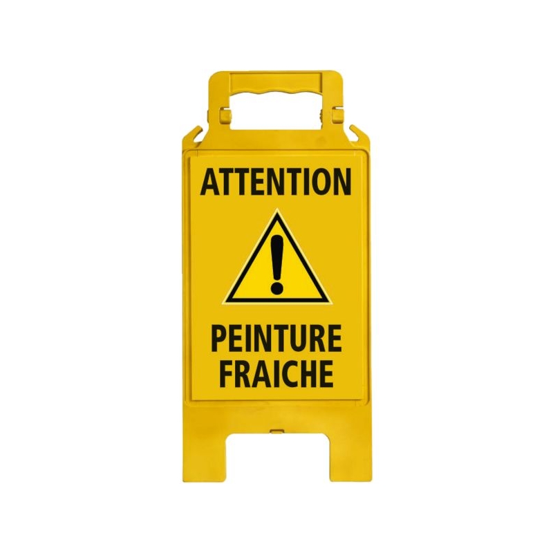 En polypropylène avec renforts de maintien. Utilisation temporaire intérieure et extérieure. Poignée ergonomique, large surface d'impression. Clip de maintien en position ouverte, grande stabilité. Crochets pour chaîne de signalisation. H x l : 600 x 275 mm Épaisseur (plié) : 23 mm