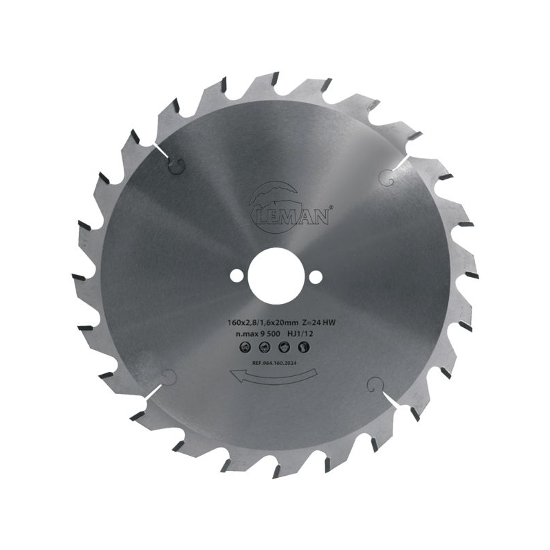 Lame de scie carbure, denture alternée pour le travail du bois. Corps en acier traité et rectifié, tensionné.