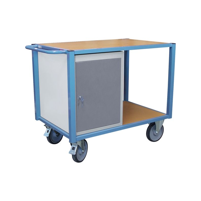 Arceau de poussée, plateau en médium de 16 mm d'épaisseur. Roues à bandage TPE Ø 200 mm, 2 fixes + 2 pivotantes à frein. Verrouillage des portes et des tiroirs à fermeture centralisée avec 1 jeu de 2 clés fourni. Capacité de charge : 500 kg Dim. plateaux bois : 1060 x 680 mm Dim. blocs : 470 x 625 x 620 mm Dim. hors-tout : 1185 x 680 x 930 mm Équipements : - 1 bloc porte équipé d'une étagère, - 1 bloc tiroirs (2 tiroirs hauteur 100 mm et 2 tiroirs hauteur 150 mm) Livrée montée.
