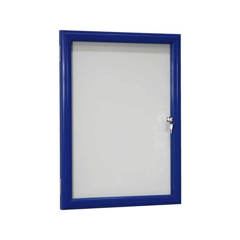 Vitrine réversible avec fond tôle laquée électrozinguée (affichage magnétique). Porte battante démontable avec charnière inox. Encadrement aluminium anodisé, façade verre Sécurit 4 mm. Fermeture par serrure dans le vitrage. Fixation murale 4 points. Épaisseur hors-tout : 35 mm Épaisseur utile : 21 mm Existe en noir, gris et rouge.