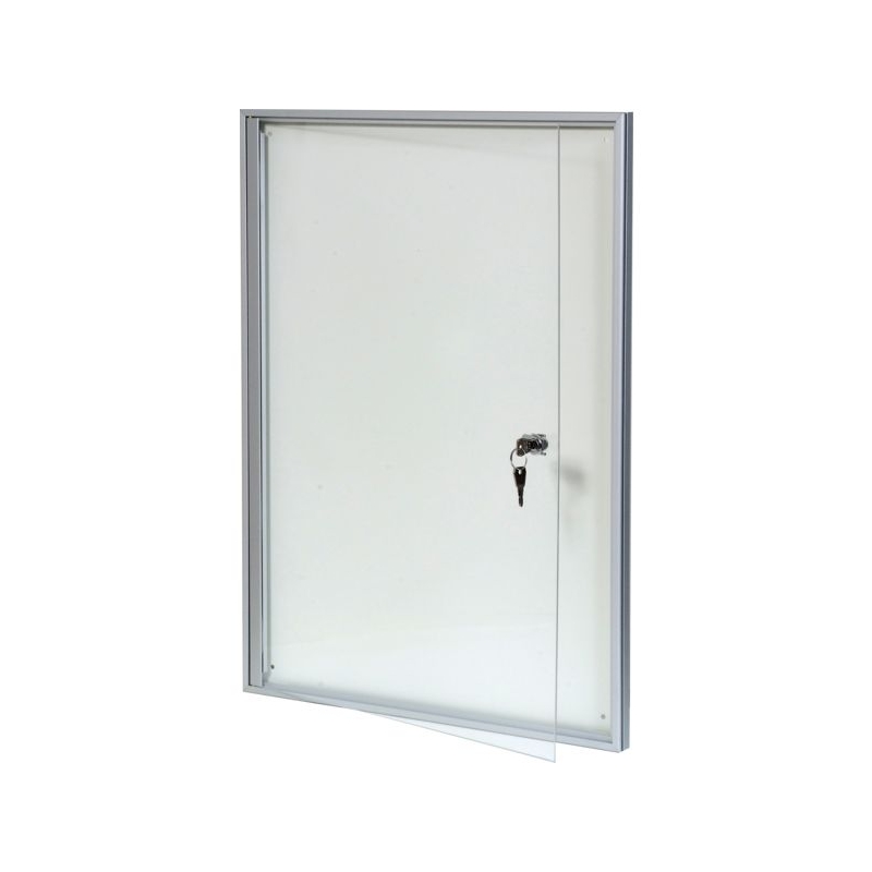 Porte battante, fermeture par serrure à clé avec pose à droite. Profil alu anodisé naturel, façade plexiglas avec entourage à partir du format 6 feuilles. Fond tôle blanc pour affichage magnétique. Fixation murale 4 points. Absence d'entourage de porte pour le format 4 feuilles. Épaisseur hors-tout : 20 mm Épaisseur utile : 12 mm